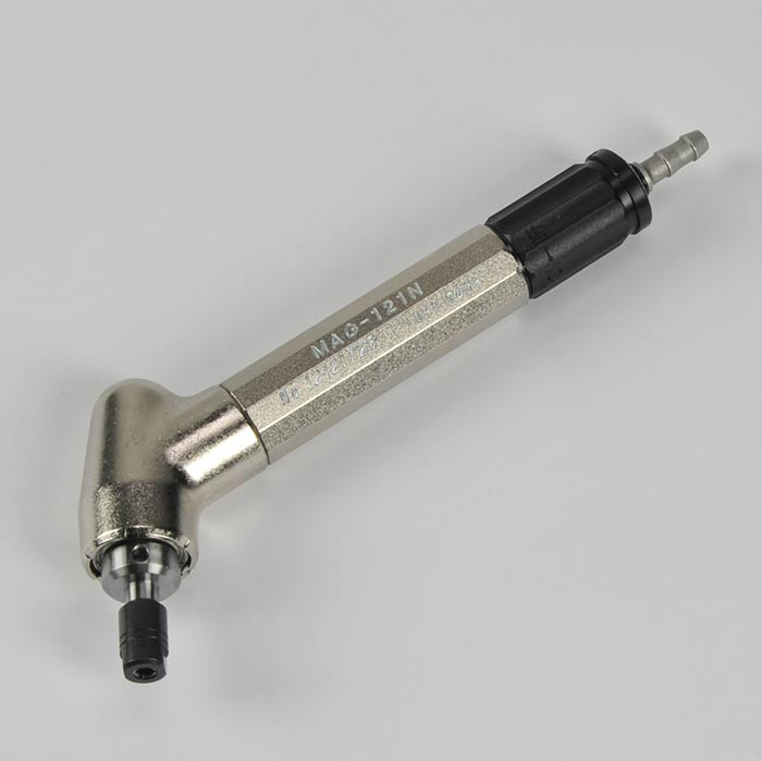 • Amoladora angular de aire 135 ° MAG-121N con collarín Ø 3 mm, velocidad máxima 52.500 rpm, presión de funcionamiento 6 bar, peso 140 g, completa con accesorios en la caja