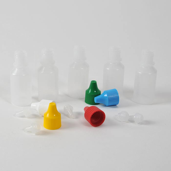 • Frascos cuentagotas de 15 ml de LDPE, cierre en rojo, verde, azul, amarillo y blanco, paquete = 5 piezas