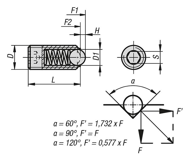 Piezas presión con resorte, hexágono interior y bola, versión larga,fuerza muelle estándar