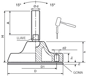 Base de poliamida reforzada y espiga en acero cincado. *Peso max. estático calculado con el eje vertical. Utilizando un martillo se pueden abrir los agujeros pre-marcados y fijar el pie al suelo. Contratuerca disponible en el grupo accesorios para pies.