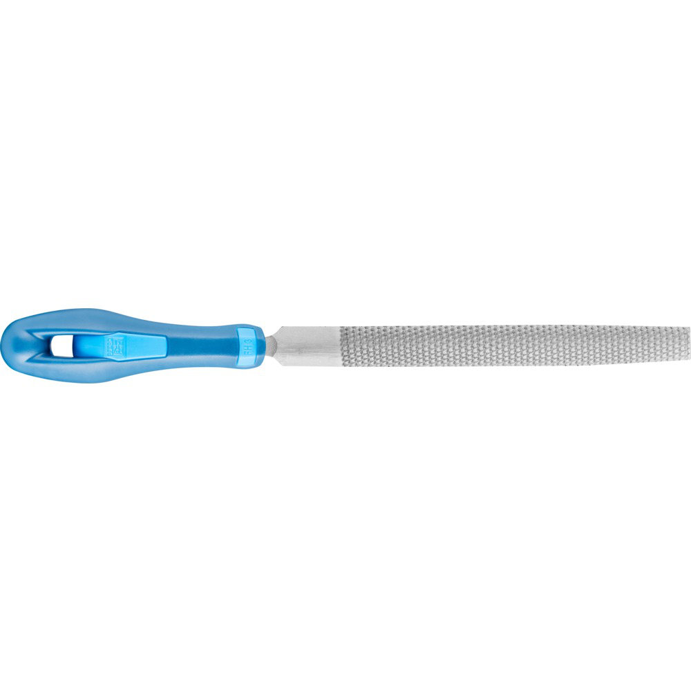 Lima de media caña terminada en punta con corte de escofina en dos caras. Forma C según DIN 7263. Ejecución con espiga.