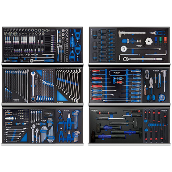 Contiene diferentes tipos de herramientas, entre ellas: puntas, destornilladores, vasos, llaves, buriles,cúter, alicates y martillos