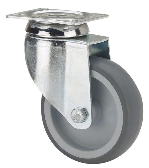 • Chapa de acero embutida. Acabado cincado brillante. Pletina giratoria y agujero pasante. Con doble rodamiento de bolas. Cojinetes: Liso.