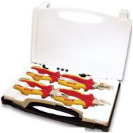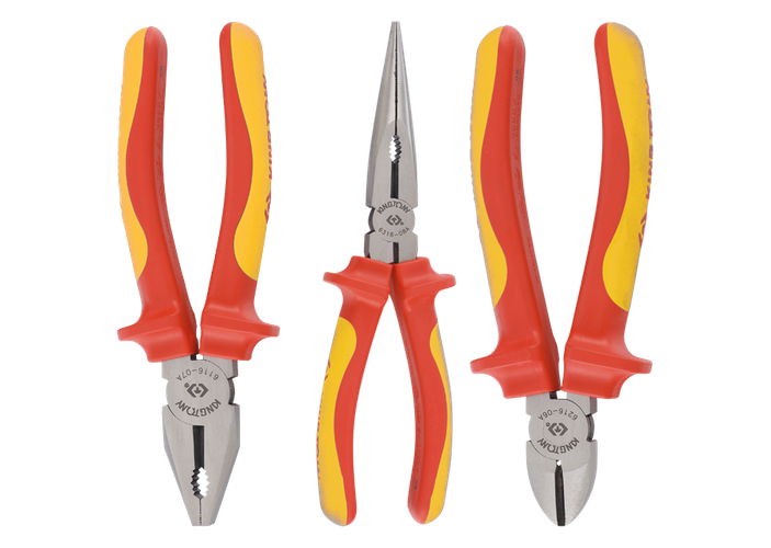 • Contenido: Alicate universal VDE de 180 mm (711040 0180). alicate de corte lateral o telefónico VDE de 200 mm (711050 0200). alicate de corte diagonal VDE de 160 mm (711045 0160). pinza pelacables VDE de 160 mm (711060 0160)