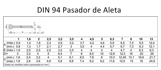 El pasador de aleta de acero DIN 94 está formado por un alambre de sección semicircular plegado sobre sí mismo y permitiendo un ojal que actúa de tope y facilita su extracción. Una vez introducido en su alojamiento se doblan en sentido opuesto sus extremos produciendo su fijación.