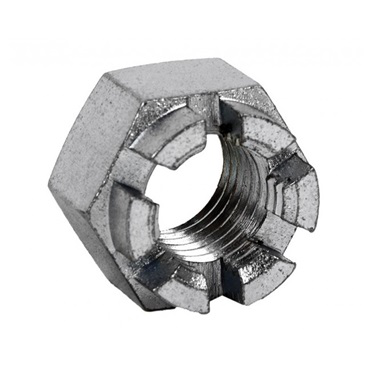 Tuerca hexagonal a la que se le han practicado unas ranuras que coinciden con los ejes de sus caras, por las que se introduce un pasador que atraviesa un taladro perpendicular al eje del tornillo, produciendo, así, un enclavamiento del tornillo con la tuerca.