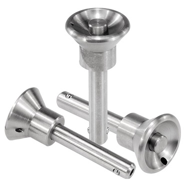 Indicación: Los pernos de bloqueo de bola sirven para fijar y unir piezas de trabajo y otras piezas de forma rápida y sencilla. Presionando el botón pulsador, se pueden desbloquear las dos bolas y, de este modo, insertar las piezas que se vayan a conectar. Al soltar el botón pulsador, las bolas bloquean la conexión de forma segura y permanente. Resistente a la corrosión. Posibilidad de fijación para cable de retención. Rango de aplicación de temperatura máx. +250 °C.