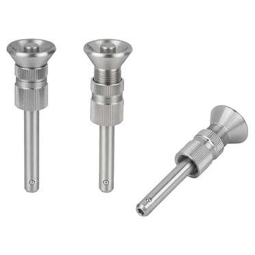 Indicación: Los pernos de bloqueo de bola sirven para fijar y unir piezas de trabajo y otras piezas de forma rápida y sencilla. Presionando el botón pulsador, se pueden desbloquear las dos bolas y, de este modo, insertar las piezas que se vayan a conectar. Al soltar el botón pulsador, las bolas bloquean la conexión de forma segura. Con la contratuerca y la tuerca de ajuste se ajusta el intervalo de longitud de forma continua. Esto permite una colocación en la contrapieza sin juego.