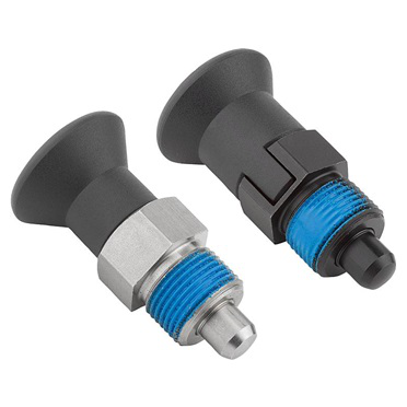 Indicación: Los pernos de bloqueo se aplican para impedir el cambio de la posición de bloqueo por fuerzas transversales. El perno solo puede colocarse en otra posición de bloqueo una vez que se haya desacoplado manualmente. Para evitar que la clavija de bloqueo rebote cuando sea necesario desacoplarla tras un periodo de tiempo prolongado, se utilizará la forma CP. La profundidad de montaje se puede adaptar exactamente a los componentes existentes mediante el seguro roscado, por lo que no se requiere ningún tope regulable. El seguro roscado es un recubrimiento de poliamida de sujeción que se aplica específi camente (mancha).