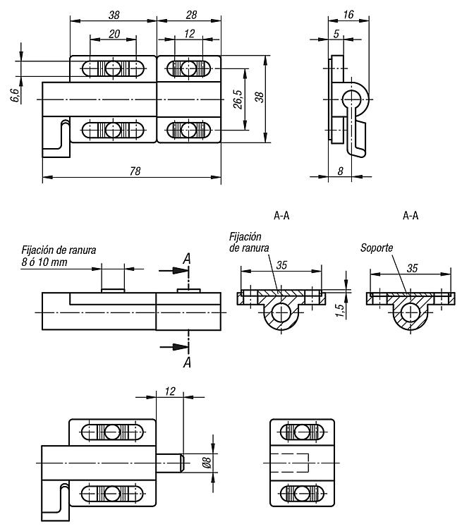• 2 fijaciones por ranura para el montaje en perfiles con ranura (para ranuras de 8 ó 10 mm).