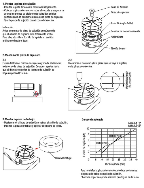 Indicación: Pinzas para sujetar contornos internos. El contorno de la pieza que se va a sujetar se inserta en la pinza de sujeción. Son aptas para superfi cies de forma libre y contornos asimétricos. El mecanismo de la pinza garantiza una sujeción segura de la pieza de trabajo.