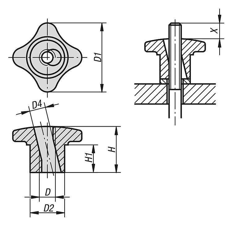 Indicación: Las empuñaduras en cruz con función de sujeción rápida se aplican en cualquier dispositivo que no requiera grandes fuerzas de sujeción. La función se alcanza mediante una rosca semilateral.