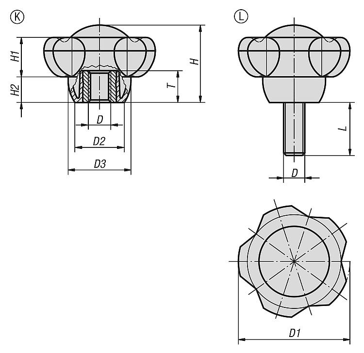 Empuñaduras estrella,acero, forma K, RAL 7021.D=M8