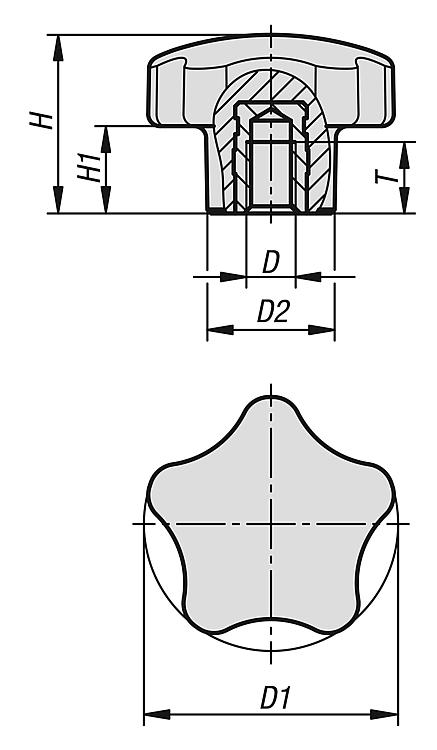 Empuñaduras estrella 5 picos rosca int.D=M10 D1=50