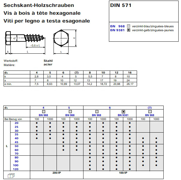 El tornillo DIN 571 es un tornillo de cabeza hexagonal y sin huella. Tiene cuerpo cilíndrico a grandes rasgos, aunque -si cabe- ligeramente cónico, y no está roscado en su totalidad. Por eso, dispone de cuello. Termina en punta. Se conoce también como tornillo barraquero o tirafondos. Generalmente se usa para madera o aglomerados. Se logra un buen apretado. No requiere taladrado previo, ya que es autotaladrante o autoperforante.
