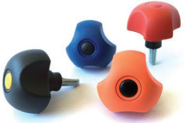 • Casquillo de latón roscado, muelle de acero inoxidable. PA Poliamida negra reforzada con tapones en los siguientes colores... Negro, naranja, rojo, azul,amarillo y gris similares a los RAL indicados. Especialmente indicado para aplicaciónes de seguridad. Este pomo sólo se puede roscar/desenroscar cuando se presiona hacia abajo y simultaneamente se gira.