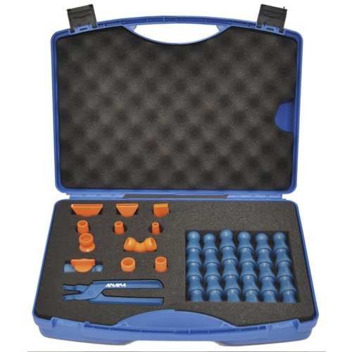 6 módulos de mangueras. 1 alicate para montaje. 1 distribuidor en Y. 1 grifo de cierre. 3 toberas planas: 8orificios/50 mm/35 mm. 3 toberas redondas: Ø 6.4 / 9.5 / 12.7 mm. 2 conexiones roscadas de 3/8” y 1/2”. 1válvula de retención de 1/2”