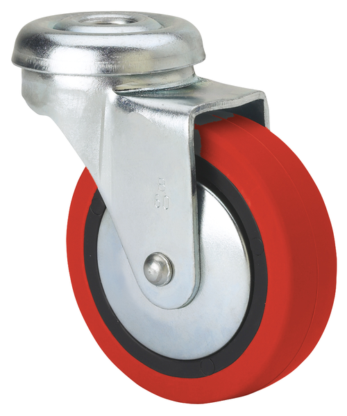 • Ruedas rojas de poliuretano inyectado blando especialmente indicado para soportar cargas hasta 40 Kg.