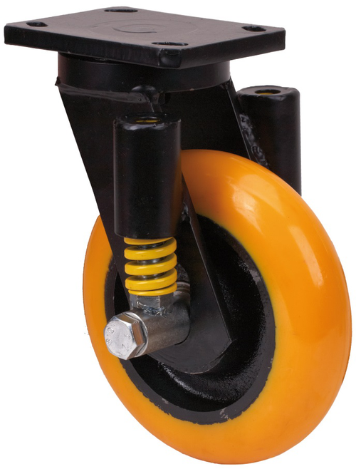 • Ruedas con núcleo de acero y banda de poliuretano fundido con dureza de 95° shore A con banda de rodadura en forma balona, especialmente indicada para soportar altas cargas hasta 800 Kg.Con soporte de suspensión elástica mediante incorporación de muelle muy resistente, ideal en suelos irregulares donde su amortiguación actúa.