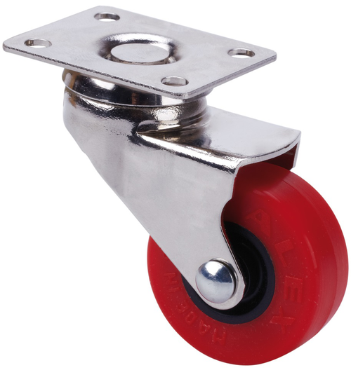 • Ruedas rojas de poliuretano inyectado blando especialmente indicado para soportar cargas hasta 40 Kg.