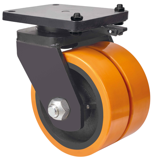 • Rueda doble con núcleo de acero y banda de poliuretano fundido con dureza de 95°shoreA, especialmente indicada para soportar altas cargas hasta 4.000Kg.