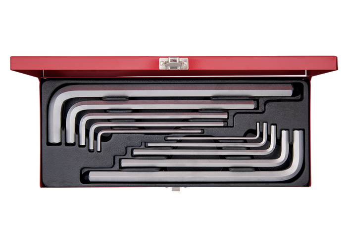 • Caja metálica. Llaves macho hexagonales extra largas acodadas.