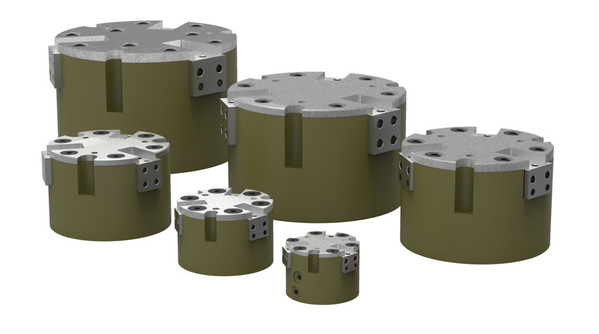 Diseñado para alimentación / expulsión de piezas, aplicaciones de torno y grandes piezas redondas pesadas. Pinza autocentrante con fuerza de agarre muy elevada. Paté separador opcional para inserción / expulsión de piezas. Ideal para sujetar piezas redondas de pequeñas a muy grandes. La fuerza de agarre varía de 445N a 13345N y una repetibilidad de +/- 0.03 mm.